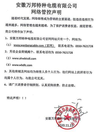 鄭重聲明:安徽萬邦特種電纜有限公司官方網站為:www.wanbangcable_com.achie.cn,除此之外無任何子網站或合作網站,其余均為假冒偽劣。電話:0550-7621728 13485756353 地 址:安徽省天長市滁州高新技術產業開發區經四路29號